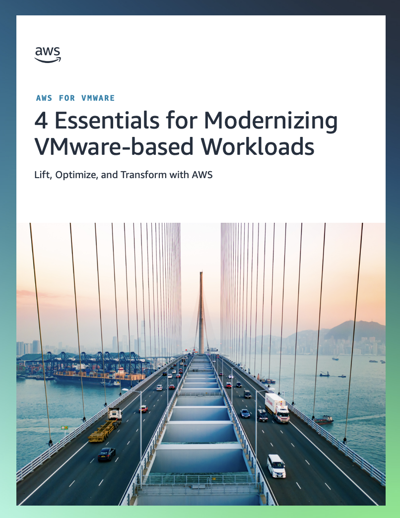 Read the eBook 4 Essentials for Modernizing VMware-Based Workloads—Lift, Optimize, and Transform with AWS to learn critical considerations for driving successful cloud migration and to see how AWS is helping organizations with VMware-based workloads achieve strategic cloud adoption for long-term success.