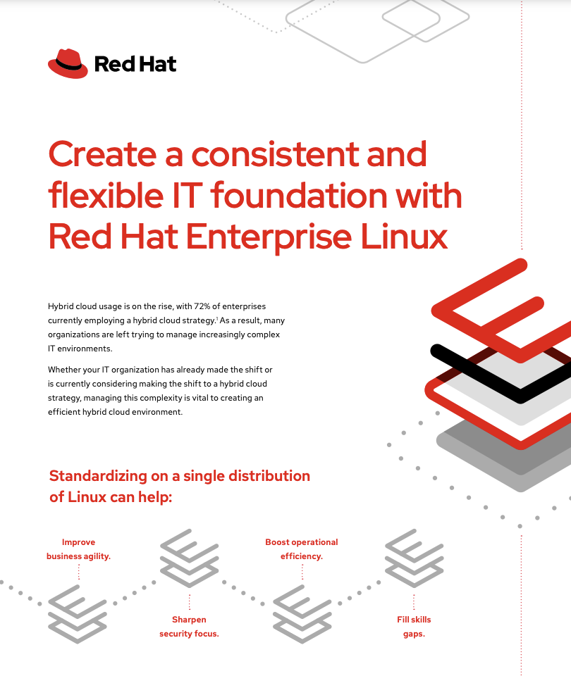 Hybrid cloud usage is on the rise, with 72% of enterprises currently employing a hybrid cloud strategy. As a result, many organizations are left trying to manage increasingly complex IT environments. Review this fact-filled infographic to learn more about how standardizing on Red Hat® Enterprise Linux® can help create a consistent and flexible IT foundation.