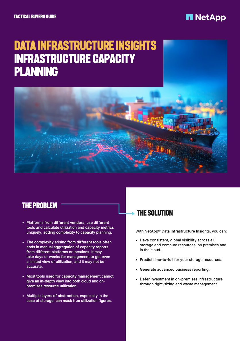 This tactical buyer’s guide helps IT leaders cut through the complexity by providing actionable strategies to identify and eliminate waste, optimize resource usage, and defer unnecessary spending. Learn how NetApp® Data Infrastructure Insights delivers unified, end-to-end visibility across on-premises and cloud infrastructure, enabling smarter capacity planning, right-sizing, and workload balancing.
