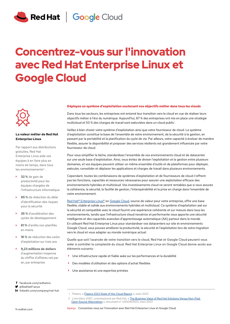Lisez cet aperçu pour savoir comment votre entreprise peut simplifier sa migration vers le cloud avec Red Hat et Google.