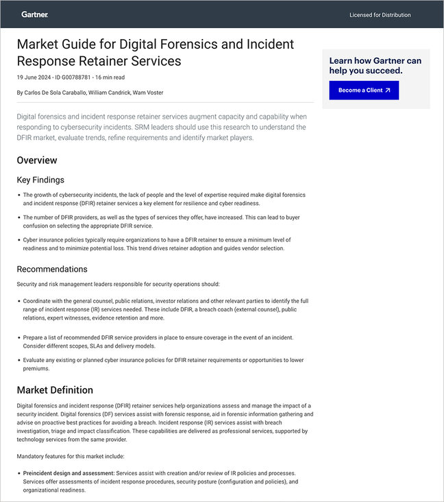Gartner® has created the “Market Guide for Digital Forensics and Incident Response Retainer Services.” It arms cybersecurity leaders with insights to assess their IR strategies and identify providers that can bolster resilience.