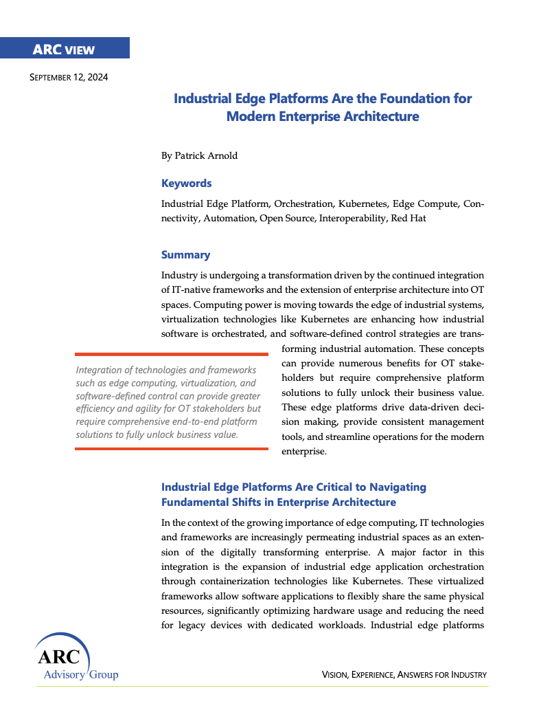 The partnership with Red Hat, ABB and Schneider Electric, was formed to deliver comprehensive solutions for industrial automation and edge computing. Using the power of Red Hat® OpenShift® and Red Hat Device Edge, these collaborations offer robust, scalable, and flexible solutions tailored to manufacturing organizational needs. Key features include real-time control, network automation, cybersecurity assessment, and more. Read this ARC view advisory report for details.