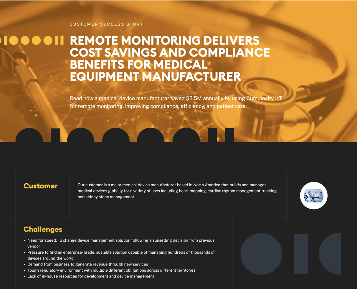 With hundreds of thousands of medical devices in hospitals, clinics, and patients’ homes around the world, remote product management is vital for this customer—a major player in the healthcare equipment sector with products including cardiac rhythm monitors, heart mapping devices, and kidney stone management. So, when the vendor they relied upon for remote analytics announced it was sunsetting its product, they needed a new solution, fast.