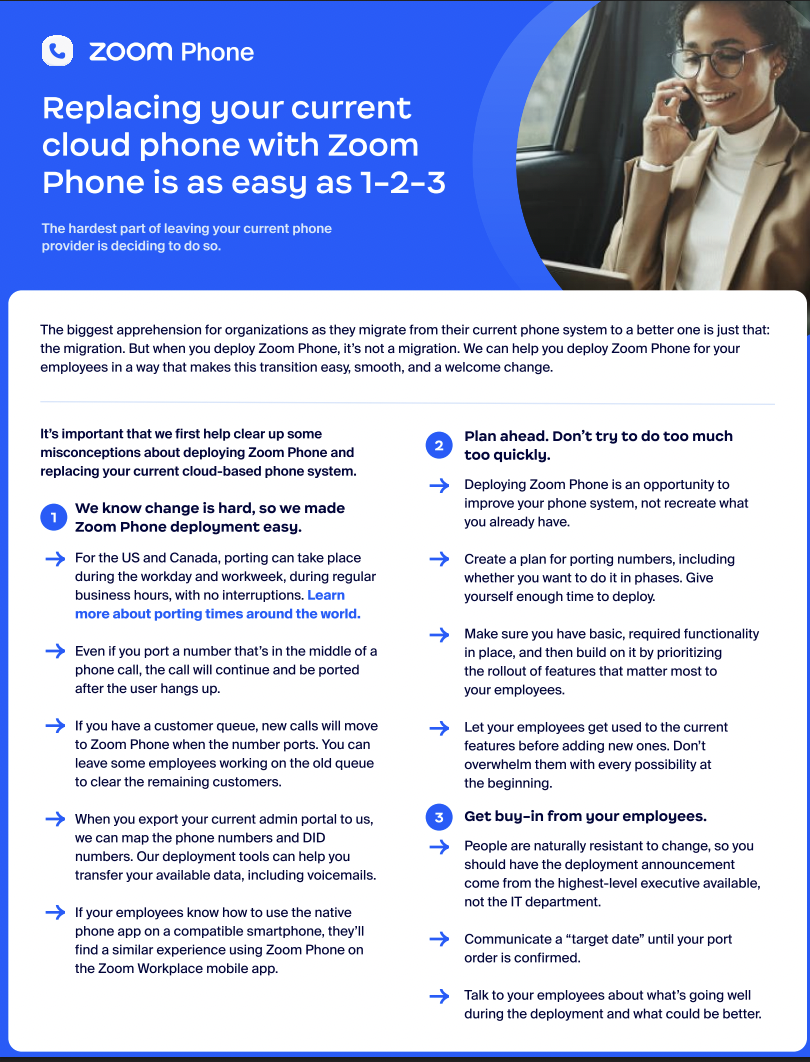 Not all cloud phone solutions are made equal. If you find your current cloud phone system is falling short, Zoom Phone with AI Companion delivers a secure, reliable experience that supports your business needs. Discover how easy a Zoom Phone deployment can be with our cloud-to-cloud migration guide.