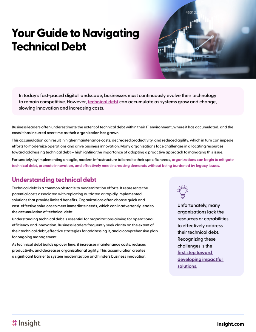 Technical debt silently drains resources, increases costs, and stifles agility — but it doesn’t have to. This article demystifies what technical debt really means for your organization, highlighting the most common challenges leaders face and offering actionable strategies to address them. From cost optimization to infrastructure modernization, a proactive approach can help reduce risk, boost efficiency, and accelerate innovation. Explore the full article to learn how to identify, remediate, and prevent technical debt while laying the groundwork for a more resilient, future-ready organization.
