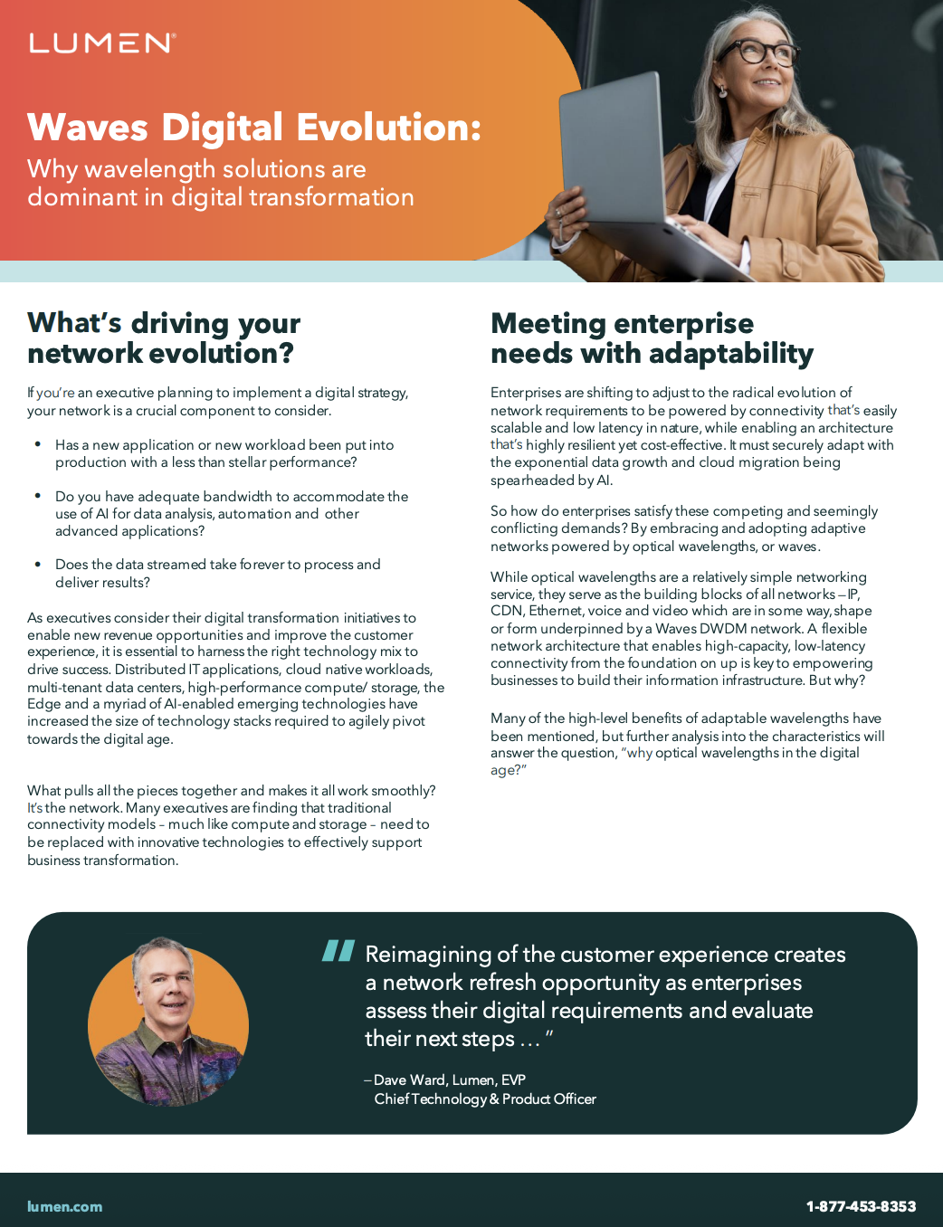 Lumen® Wavelength Solutions enable enterprises with ultra-fast, secure connectivity designed to meet the demands of today’s data-driven world. With adaptive optical networking and scalable infrastructure, businesses can better support mission-critical applications, real-time collaboration and massive data workloads. Discover how Lumen delivers the network performance and security to help move your enterprise forward.