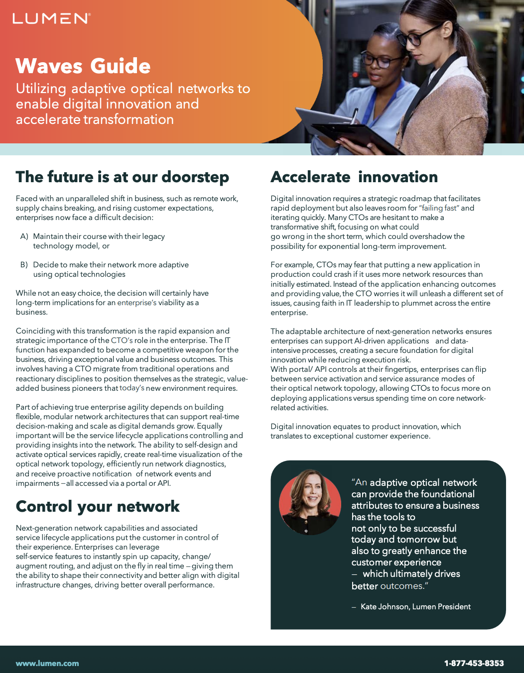 Experience next-gen connectivity with Lumen® Wavelength Solutions, designed to meet the demands of modern enterprises with speed, flexibility and reliability. With adaptive optical networking and scalable infrastructure, businesses can confidently support mission-critical applications, real-time collaboration and massive data workloads. Discover how Lumen delivers the network performance and security to help move your enterprise forward.