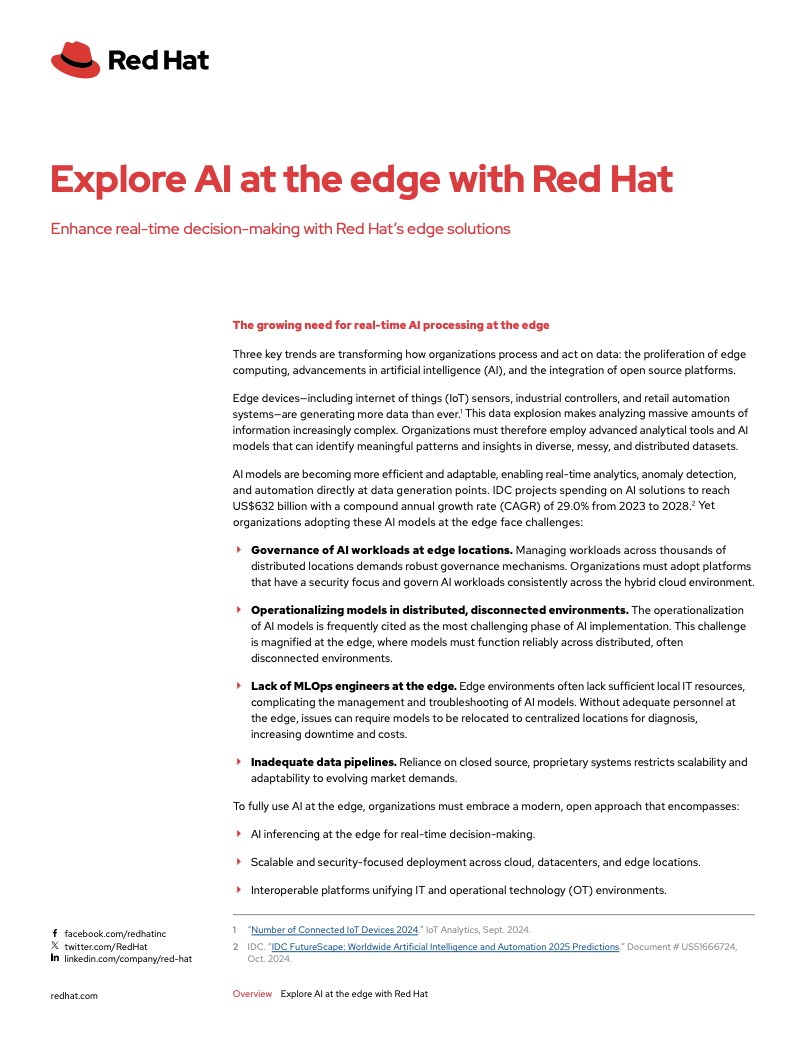 Organizations are facing increasing complexity in processing and acting on data due to the growth of edge computing, advancements in AI, and open source platforms. Edge devices generate massive amounts of data, requiring advanced analytical tools and AI models for insight. While AI models are becoming more efficient for real-time analytics at data generation points, organizations adopting AI at the edge encounter challenges such as governing AI workloads across distributed locations, operationalizing models in disconnected environments, a shortage of MLOps engineers at the edge, and inadequate data pipelines often due to proprietary systems. To effectively utilize AI at the edge, organizations need to adopt a modern, open approach that includes AI inferencing at the edge for real-time decision-making, scalable and secure deployments across hybrid environments, and interoperable platforms that unify IT and operational technology.