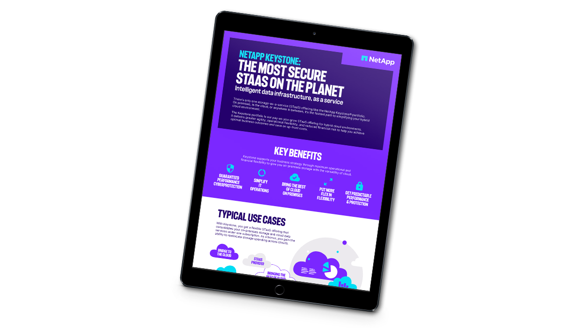 NetApp® Keystone® brings the best of both worlds — the control of on premises and the flexibility of cloud — into a single, flexible STaaS subscription. Keystone helps you scale on demand, optimize storage spending, and reduce upfront costs for hybrid cloud environments.
