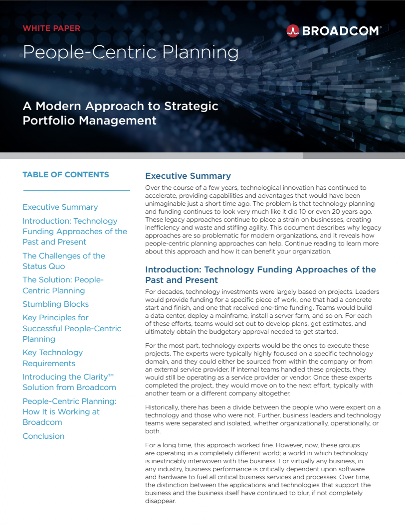 Broadcom is a leader in the value stream management software market. With the Broadcom® Clarity™ solution, businesses can implement and manage an effective, efficient people-centric planning approach. The solution enables teams to gain the visibility required to maximize alignment, reduce inefficiencies, and speed time to value.
