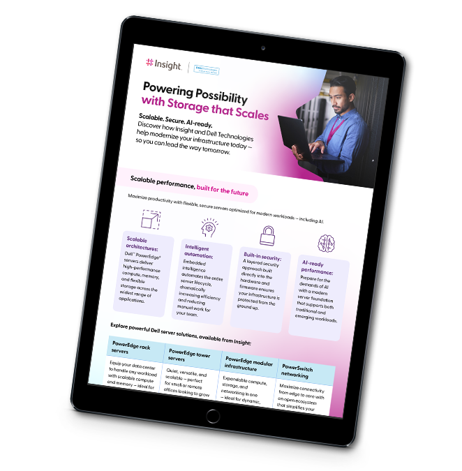 Today’s workloads require infrastructure that is flexible, intelligent, and secure. Insight and Dell Technologies provide scalable, AI-ready solutions that help organizations modernize operations while preparing for the future. Explore how flexible, cloud-integrated storage can help your organization adapt to growth, ensure reliable performance across environments, and simplify data management. From core to cloud, Insight and Dell create a foundation that fuels productivity, safeguards data, and empowers organizations to lead with agility and confidence. Get all the details in this infographic.