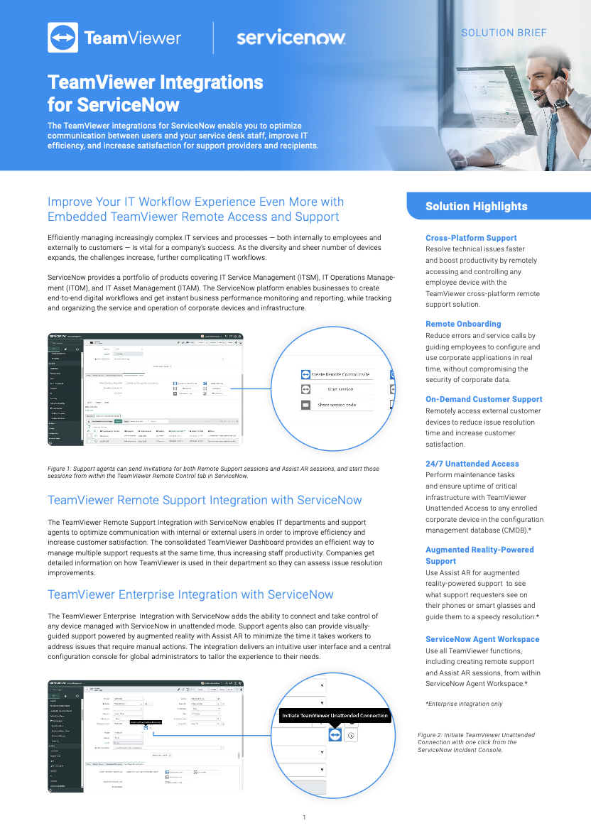 Empower your IT teams by integrating advanced remote support with next-level security into ServiceNow. Integrating TeamViewer with ServiceNow is a simple and fast way to get the tools you need to speed time to resolution, reduce downtime, and optimize costs.