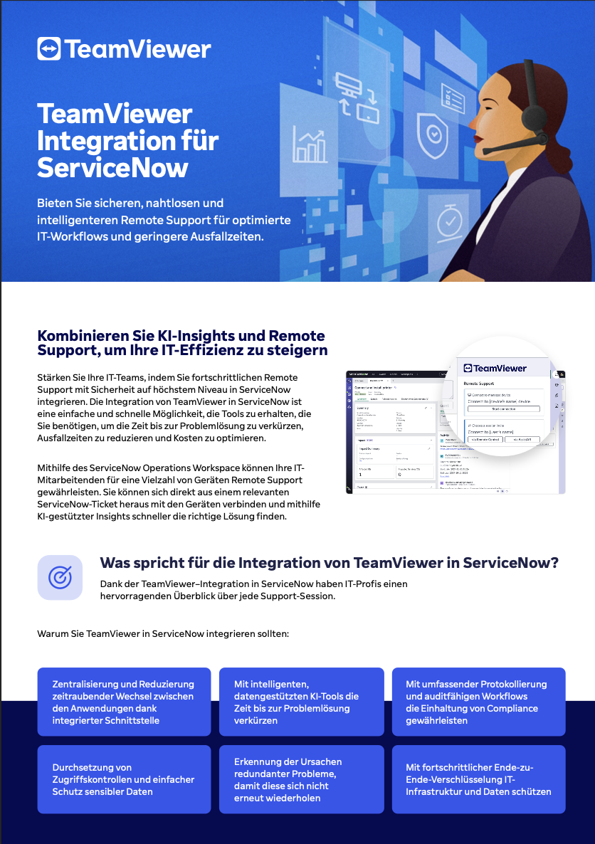 Stärken Sie Ihre IT-Teams, indem Sie fortschrittlichen Remote Support mit Sicherheit auf höchstem Niveau in ServiceNow integrieren. Die Integration von TeamViewer in ServiceNow ist eine einfache und schnelle Möglichkeit, die Tools zu erhalten, die Sie benötigen, um die Zeit bis zur Problemlösung zu verkürzen, Ausfallzeiten zu reduzieren und Kosten zu optimieren.