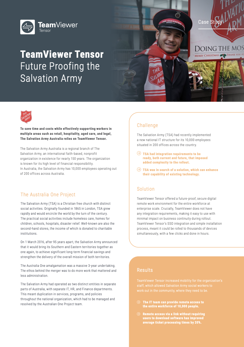 To save time and costs while effectively supporting workers in multiple areas such as retail, hospitality, aged care, and legal, The Salvation Army Australia relies on TeamViewer Tensor.