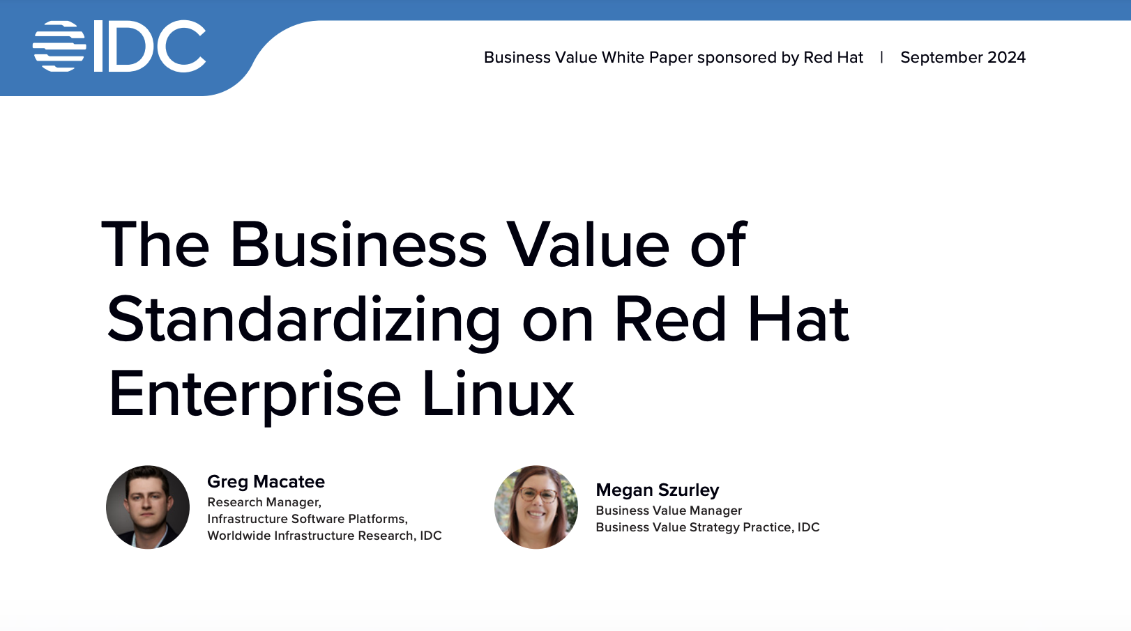 IDC spoke with organizations that have standardized on Red Hat® Enterprise Linux® between their on-premise and cloud infrastructure environments, with many running Red Hat Insights in tandem. They cited numerous benefits that they realized from their standardization efforts, including higher efficacies and efficiencies of their IT, developer, and security teams; improved oversight and risk management of their environments; better compliance; reduced downtime; and faster go-to-market efforts.