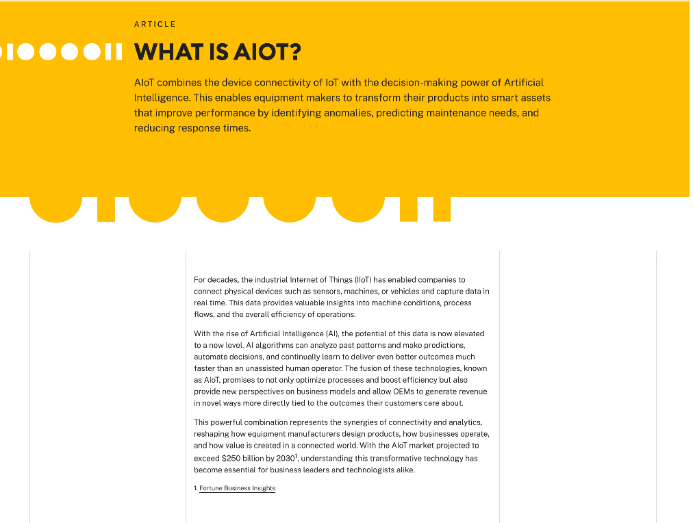 AIoT combines the device connectivity of IoT with the decision-making power of Artificial Intelligence. This enables equipment makers to transform their products into smart assets that improve performance by identifying anomalies, predicting maintenance needs, and reducing response times.