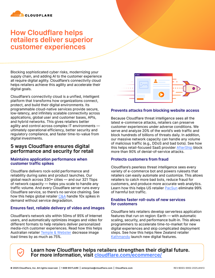 Cloudflare’s connectivity cloud is a unified, intelligent platform that transforms how organizations connect, protect, and build their digital environments. Its programmable cloud-native services provide secure, low-latency, and infinitely scalable connectivity across applications, global user and customer bases, APIs, and hybrid networks. This gives retailers better agility and control across complex IT environments — ultimately operational efficiency, better security and regulatory compliance, and faster time-to-value from digital investments.